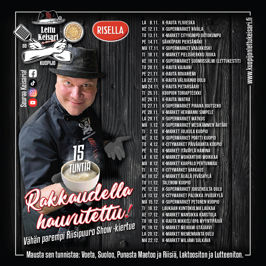 Kuopijon Lettukeisarin riisipuuroshow käynnistyy 8.11. Ylivieskasta, seuraa kiertuetta FB:ssa tai täältä.